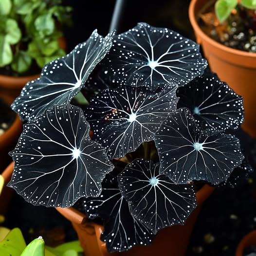 Бегонията „Лунна пеперуда“ има тъмни, привличащи вниманието листа с ярки жълти и бели шарки, наподобяващи пеперуди.
